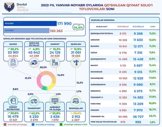 Как изменилось число налогоплательщиков за год в Узбекистане – обзор в разрезе отраслей