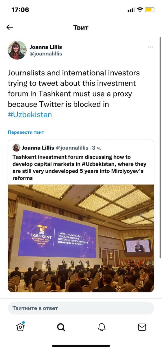 «Журналисты и международные инвесторы, пытающиеся написать в Twitter об инвестиционном форуме в Ташкенте, должны использовать прокси-сервер, потому что Twitter заблокирован в Узбекистан», — заявила журналистка.