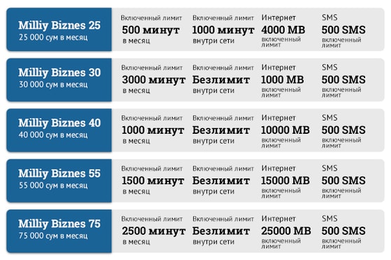 «MILLIY BIZNES» — это новая тарифная линейка, которая вобрала в себя 5 актуальных тарифных планов стоимостью от 25 000 сумов в месяц. Отличительной чертой тарифных планов «MILLIY BIZNES 30», «MILLIY BIZNES 40», «MILLIY BIZNES 55», «MILLIY BIZNES 75» стало безлимитное количество исходящих звонков внутри сети по Республике Узбекистан. Все тарифные планы линейки «MILLIY BIZNES» сконструированы таким образом, что каждый абонент имеет возможность подобрать для себя оптимальный вариант исходя из своих потребностей.