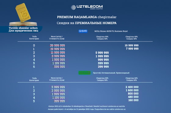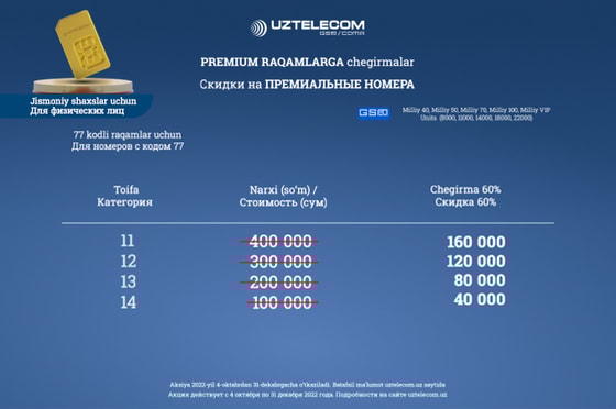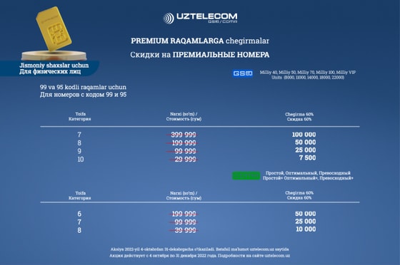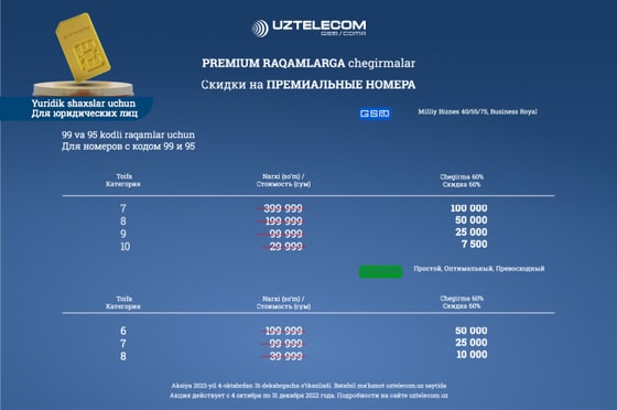 UZTELECOM объявляет акцию с большими скидками на премиум номера. Приобретайте желанный номер с выгодой до 60% при подключении на действующие тарифные планы!