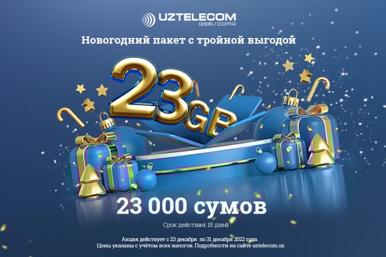 До Нового года остались считанные дни, и любимый оператор UZTELECOM подготовил для своих абонентов приятные подарки — новогодние гигабайты с выгодой. Только с 23 по 31 декабря 2022 года вы можете активировать праздничный интернет-пакет 23 GB всего за 23 тысячи сумов сроком на 15 дней. Таким образом, вы экономите, получая 1 GB мобильного трафика всего за 1000 сумов.