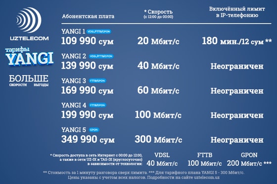 - «YANGI-5» скоростью 300 Мбит/с за 349 990 сум (предыдущий тариф UNLIM 300 с абонентской платой 999 000 сум).