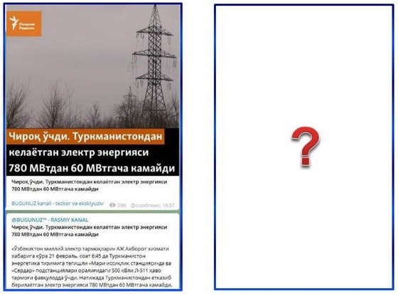 В пример была приведена статья о том, что 21 февраля информационная служба АО «Национальные электрические сети Узбекистана» официально объявило о снижении импорта из-за аварийного отключения линии 500 кВ L-511 между тепловой электрической станцией «Мари» и подстанциями «Сердар», принадлежащими корпорации «Туркменэнерго».