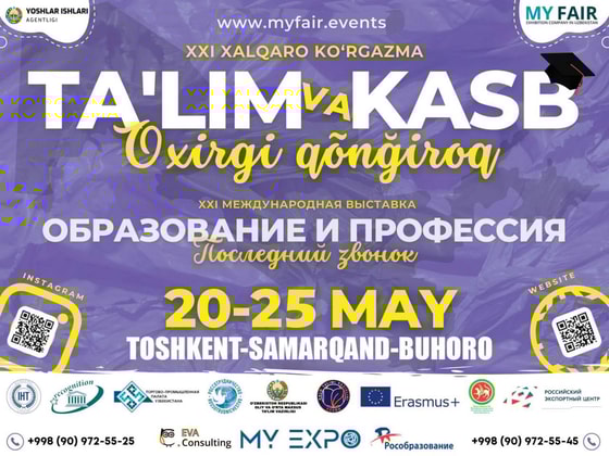 В этом году с 20 по 25 мая каждый сможет стать участником 21-ой международной выставки «Образование и профессия – Последний звонок 2022», которая будет проходить в трех городах страны: Ташкент, Самарканд и Бухара.