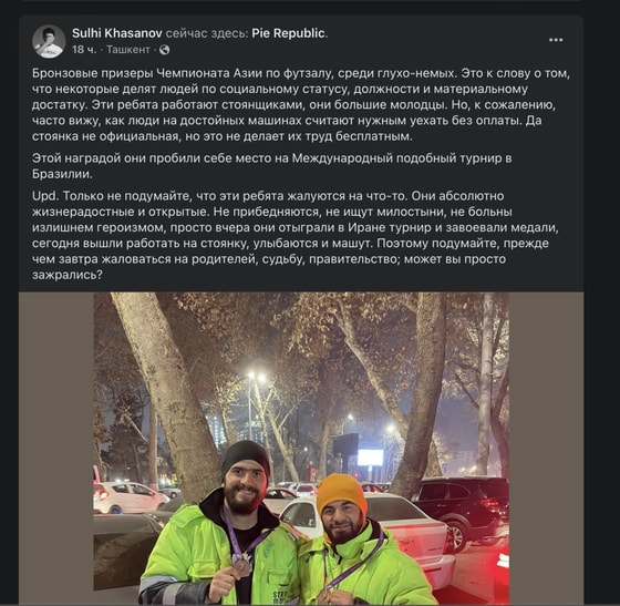Ресторатор Сулхи Хасанов рассказал в Facebook о том, что парковщики возле ресторанов в центре Ташкента оказались бронзовые призерами Чемпионата Азии по футзалу среди глухо-немых.