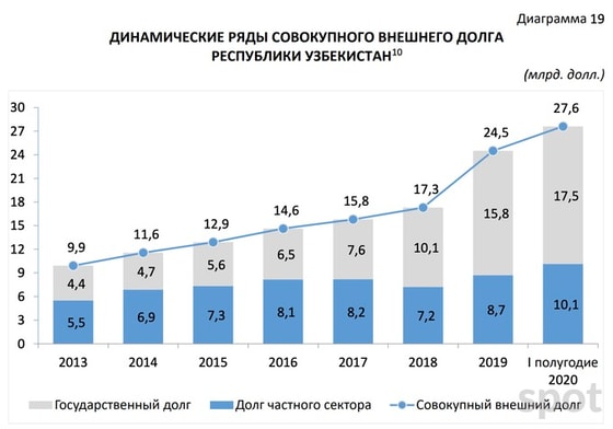 Совокупный внешний долг Республики Узбекистан на 1 июля 2020 года составил 27,6 млрд. долл., из которых 17,5 млрд. долл. является долгом государственного сектора, а 10,1 млрд. долл. – частным внешним долгом, пишет ЦБ.