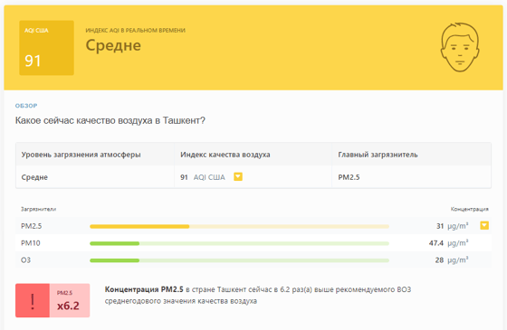 В 09:05 станция мониторинга в столице Узбекистана показывала результат в 91 AQI. Концентрация PM2.5 — в 6,2 раза выше рекомендуемого ВОЗ среднегодового значения качества воздуха.