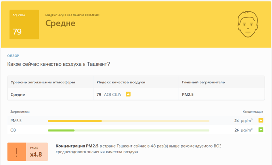 В 08:50 станция мониторинга в столице Узбекистана показывала результат в 79 AQI. Концентрация PM2.5 — в 4,8 раза выше рекомендуемого ВОЗ среднегодового значения качества воздуха.