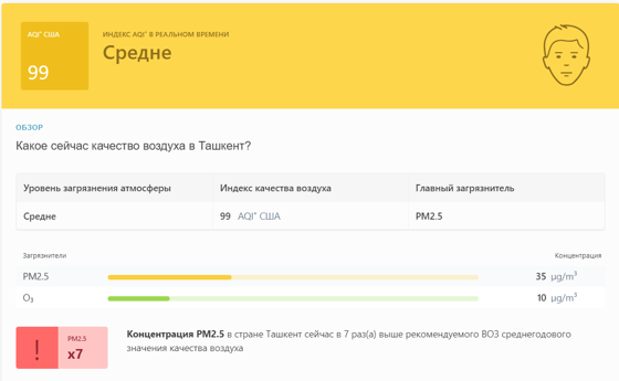 В 09:10 станция мониторинга в столице Узбекистана показывала результат в 99 AQI. Концентрация PM2.5 — в 7 раз выше рекомендуемого ВОЗ среднегодового значения качества воздуха.