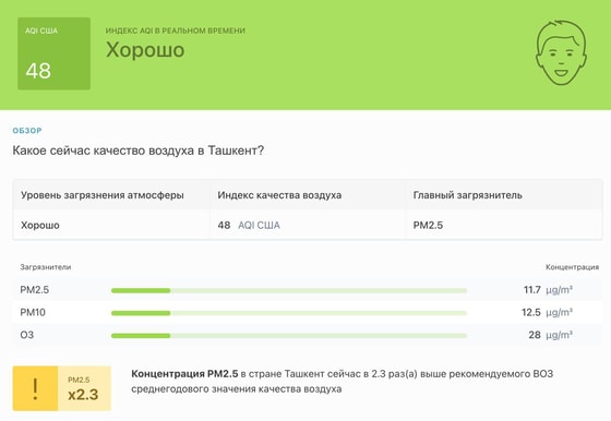В 11:00 станция мониторинга в столице Узбекистана показывала результат в 48 AQI. Концентрация PM2.5 — в 2,3 раза выше рекомендуемого ВОЗ среднегодового значения качества воздуха.