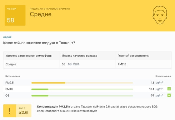 В 11:15 станция мониторинга в столице Узбекистана показывала результат в 58 AQI. Концентрация PM2.5 — в 2,6 раза выше рекомендуемого ВОЗ среднегодового значения качества воздуха.