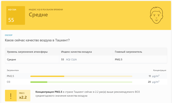 В 11:05 станция мониторинга в столице Узбекистана показывала результат в 55 AQI. Концентрация PM2.5 — в 2,2 раза выше рекомендуемого ВОЗ среднегодового значения качества воздуха.