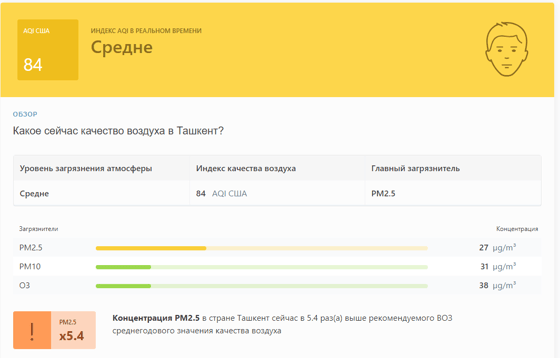 В 09:00 станция мониторинга в столице Узбекистана показывала результат в 84 AQI. Концентрация PM2.5 — в 5,4 раза выше рекомендуемого ВОЗ среднегодового значения качества воздуха.