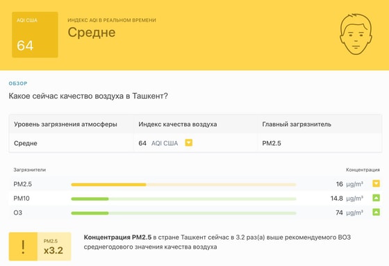 В 10:45 станция мониторинга в столице Узбекистана показывала результат в 64 AQI. Концентрация PM2.5 — в 3,2 раза выше рекомендуемого ВОЗ среднегодового значения качества воздуха.