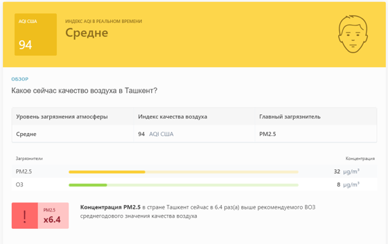 В 09:00 станция мониторинга в столице Узбекистана показывала результат в 94 AQI. Концентрация PM2.5 — в 6,4 раза выше рекомендуемого ВОЗ среднегодового значения качества воздуха.