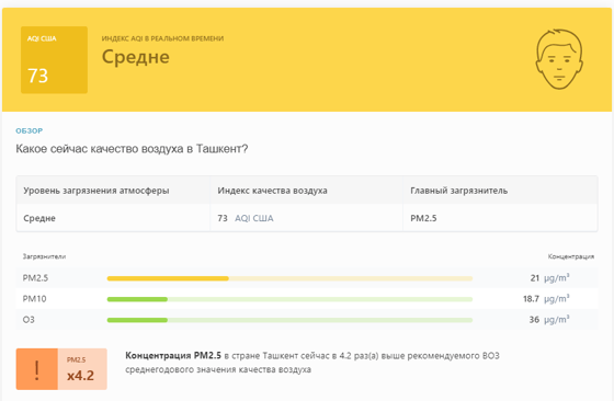 В 09:00 станция мониторинга в столице Узбекистана показывала результат в 73 AQI. Концентрация PM2.5 — в 4,2 раза выше рекомендуемого ВОЗ среднегодового значения качества воздуха.