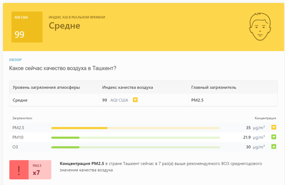 В 08:40 станция мониторинга в столице Узбекистана показывала результат в 99 AQI. Концентрация PM2.5 — в 7 раз выше рекомендуемого ВОЗ среднегодового значения качества воздуха.