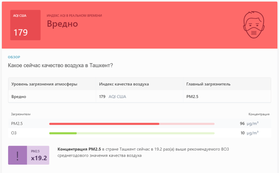 В 09:05 станция мониторинга в столице Узбекистана показывала результат в 179 AQI. Концентрация PM2.5 — в 19,2 раза выше рекомендуемого ВОЗ среднегодового значения качества воздуха.