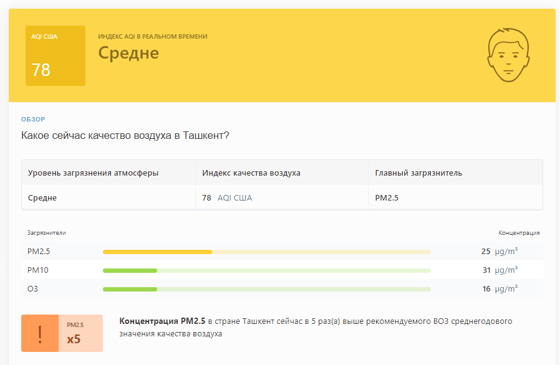 В 09:00 станция мониторинга в столице Узбекистана показывала результат в 78 AQI. Концентрация PM2.5 — в 5 раз выше рекомендуемого ВОЗ среднегодового значения качества воздуха.