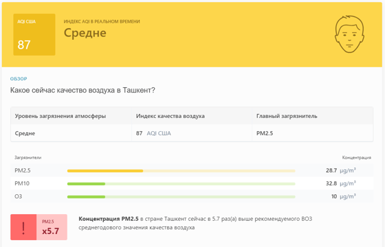 В 08:50 станция мониторинга в столице Узбекистана показывала результат в 87 AQI. Концентрация PM2.5 — в 5,7 раза выше рекомендуемого ВОЗ среднегодового значения качества воздуха.