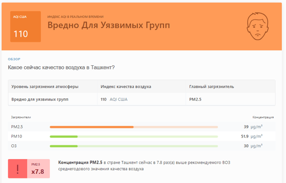 В 10:00 станция мониторинга в столице Узбекистана показывала результат в 110 AQI. Концентрация PM2.5 — в 7,8 раза выше рекомендуемого ВОЗ среднегодового значения качества воздуха.