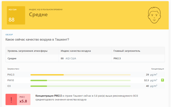 В 09:20 станция мониторинга в столице Узбекистана показывала результат в 88 AQI. Концентрация PM2.5 — в 5,8 раза выше рекомендуемого ВОЗ среднегодового значения качества воздуха.