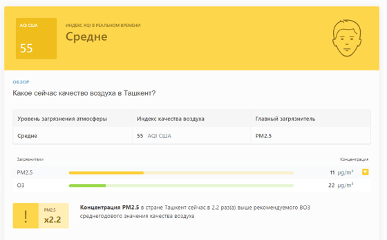В 09:05 станция мониторинга в столице Узбекистана показывала результат в 55 AQI. Концентрация PM2.5 — в 2,2 раза выше рекомендуемого ВОЗ среднегодового значения качества воздуха.