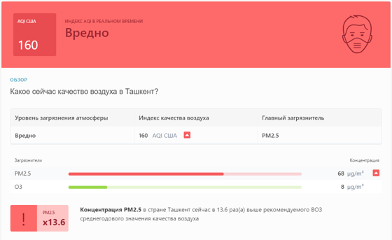 В 08:50 станция мониторинга в столице Узбекистана показывала результат в 160 AQI. Концентрация PM2.5 — в 13,6 раза выше рекомендуемого ВОЗ среднегодового значения качества воздуха.