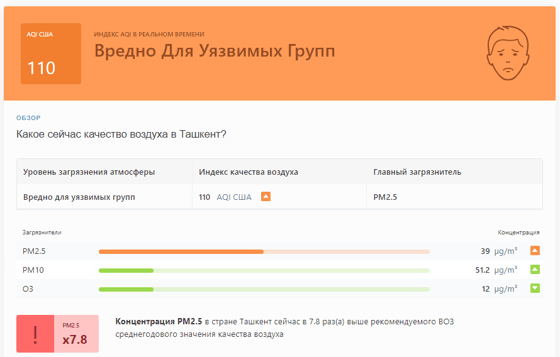 В 08:48 станция мониторинга в столице Узбекистана показывала результат в 110 AQI. Концентрация PM2.5 — в 7,8 раза выше рекомендуемого ВОЗ среднегодового значения качества воздуха.