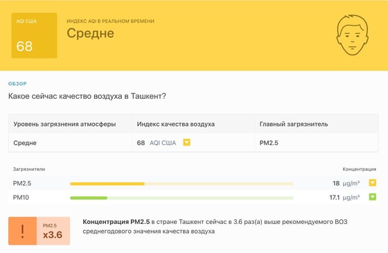В 11:25 станция мониторинга в столице Узбекистана показывала результат в 68 AQI. Концентрация PM2.5 — в 3,6 раза выше рекомендуемого ВОЗ среднегодового значения качества воздуха.