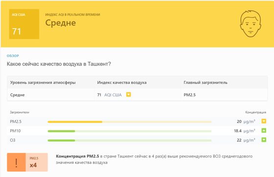 В 08:50 станция мониторинга в столице Узбекистана показывала результат в 71 AQI. Концентрация PM2.5 — в 4 раза выше рекомендуемого ВОЗ среднегодового значения качества воздуха.