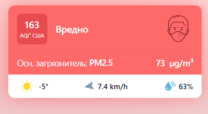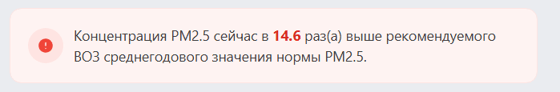 В 09:20 станция мониторинга в столице Узбекистана показывала результат в 163 AQI. Концентрация PM2.5 — в 14,6 раза выше рекомендуемого ВОЗ среднегодового значения качества воздуха.