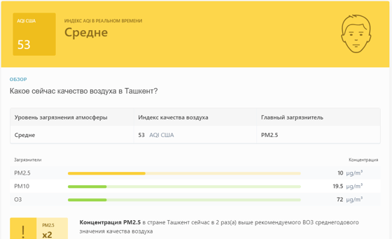 В 08:50 станция мониторинга в столице Узбекистана показывала результат в 53 AQI. Концентрация PM2.5 — в 2 раза выше рекомендуемого ВОЗ среднегодового значения качества воздуха.