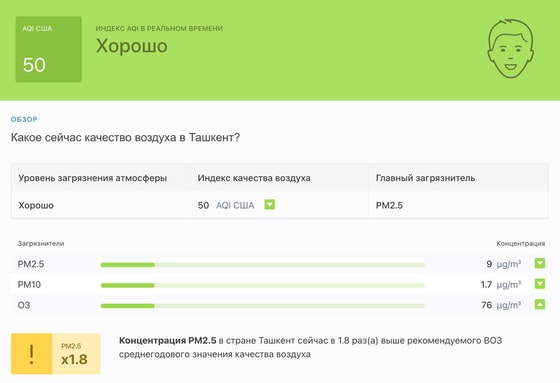В 11:00 станция мониторинга в столице Узбекистана показывала результат в 50 AQI. Концентрация PM2.5 — в 1,8 раза выше рекомендуемого ВОЗ среднегодового значения качества воздуха.