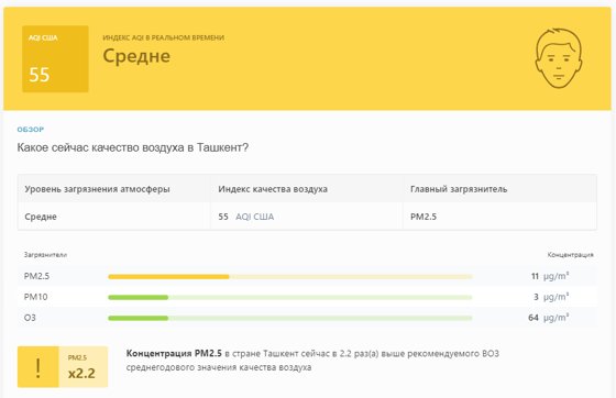 В 08:50 станция мониторинга в столице Узбекистана показывала результат в 55 AQI. Концентрация PM2.5 — в 2,2 раза выше рекомендуемого ВОЗ среднегодового значения качества воздуха.