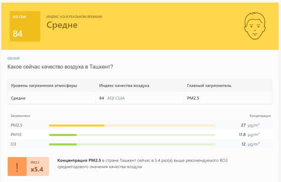 В 09:05 станция мониторинга в столице Узбекистана показывала результат в 84 AQI. Концентрация PM2.5 — в 5,4 раза выше рекомендуемого ВОЗ среднегодового значения качества воздуха.