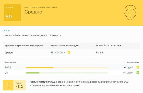В 10:40 станция мониторинга в столице Узбекистана показывала результат в 59 AQI. Концентрация PM2.5 — в 3,2 раза выше рекомендуемого ВОЗ среднегодового значения качества воздуха.