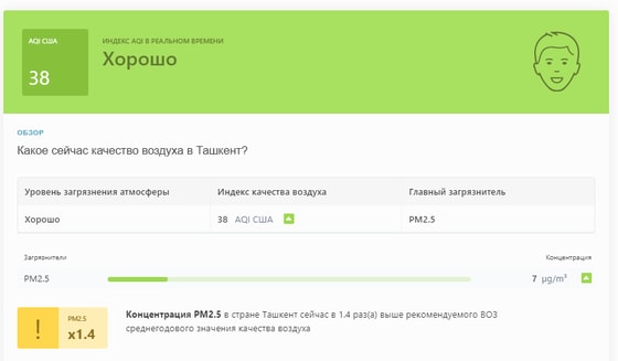 В 09:10 станция мониторинга в столице Узбекистана показывала результат в 38 AQI. Концентрация PM2.5 — в 1,4 раза выше рекомендуемого ВОЗ среднегодового значения качества воздуха.