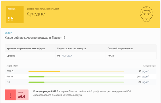 В 09:05 станция мониторинга в столице Узбекистана показывала результат в 96 AQI. Концентрация PM2.5 — в 6,6 раза выше рекомендуемого ВОЗ среднегодового значения качества воздуха.