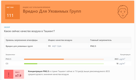 В 09:05 станция мониторинга в столице Узбекистана показывала результат в 111 AQI. Концентрация PM2.5 — в 7,9 раза выше рекомендуемого ВОЗ среднегодового значения качества воздуха.