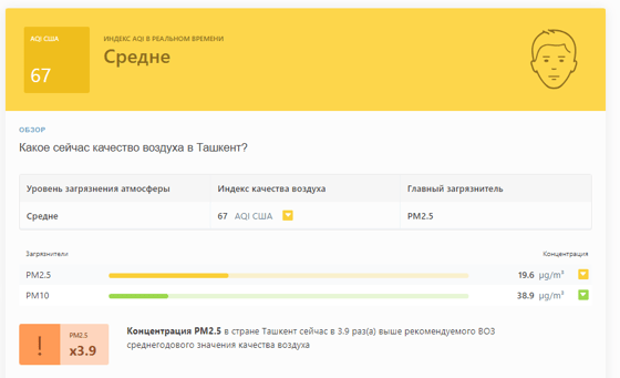 В 10:25 станция мониторинга в столице Узбекистана показывала результат в 67 AQI. Концентрация PM2.5 — 3,9 раза выше рекомендуемого ВОЗ среднегодового значения качества воздуха.