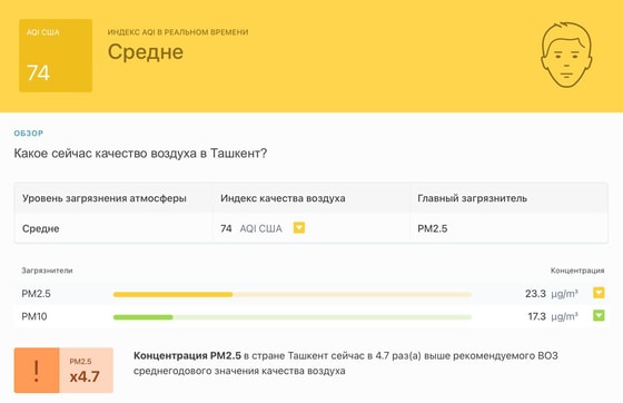 В 12:00 станция мониторинга в столице Узбекистана показывала результат в 74 AQI. Концентрация PM2.5 — в 4,7 раза выше рекомендуемого ВОЗ среднегодового значения качества воздуха.