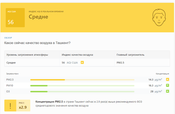 В 08:30 станция мониторинга в столице Узбекистана показывала результат в 56 AQI. Концентрация PM2.5 — в 2,9 раза выше рекомендуемого ВОЗ среднегодового значения качества воздуха.