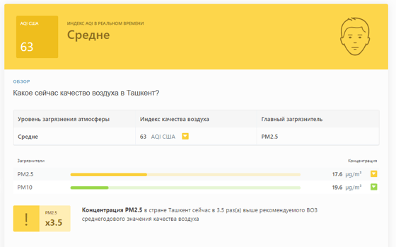 В 09:55 станция мониторинга в столице Узбекистана показывала результат в 63 AQI. Концентрация PM2.5 — в 3,5 раза выше рекомендуемого ВОЗ среднегодового значения качества воздуха.