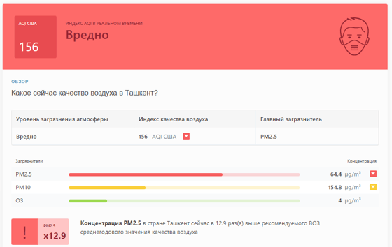 В 08:55 станция мониторинга в столице Узбекистана показывала результат в 156 AQI. Концентрация PM2.5 — в 12,9 раза выше рекомендуемого ВОЗ среднегодового значения качества воздуха.