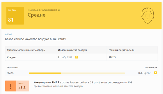 В 08:35 станция мониторинга в столице Узбекистана показывала результат в 81 AQI. Концентрация PM2.5 — в 5,3 раза выше рекомендуемого ВОЗ среднегодового значения качества воздуха.