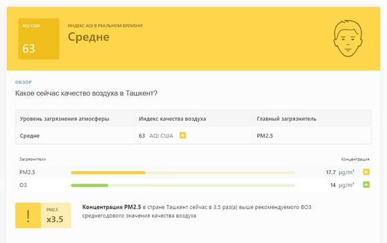 В 08:30 станция мониторинга в столице Узбекистана показывала результат в 63 AQI. Концентрация PM2.5 — в 3,5 раза выше рекомендуемого ВОЗ среднегодового значения качества воздуха.
