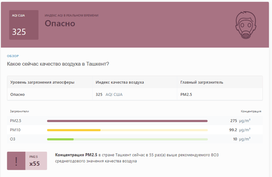 В 08:50 станция мониторинга в столице Узбекистана показывала результат в 325 AQI. Концентрация PM2.5 — в 55 раз выше рекомендуемого ВОЗ среднегодового значения качества воздуха.