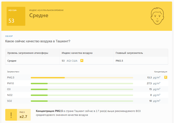 В 10:10 станция мониторинга в столице Узбекистана показывала результат в 53 AQI. Концентрация PM2.5 — в 2,7 раза выше рекомендуемого ВОЗ среднегодового значения качества воздуха.