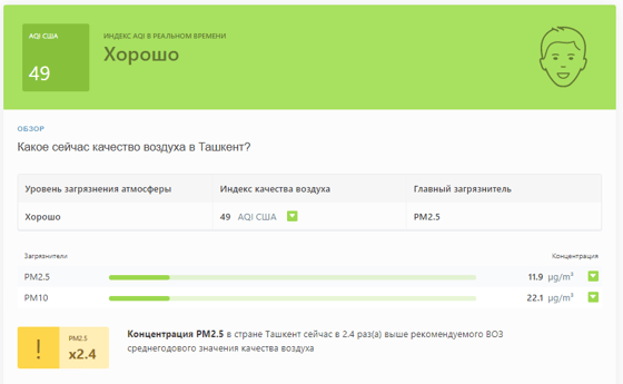 В 08:30 станция мониторинга в столице Узбекистана показывала результат в 49 AQI. Концентрация PM2.5 — в 2,4 раза выше рекомендуемого ВОЗ среднегодового значения качества воздуха.